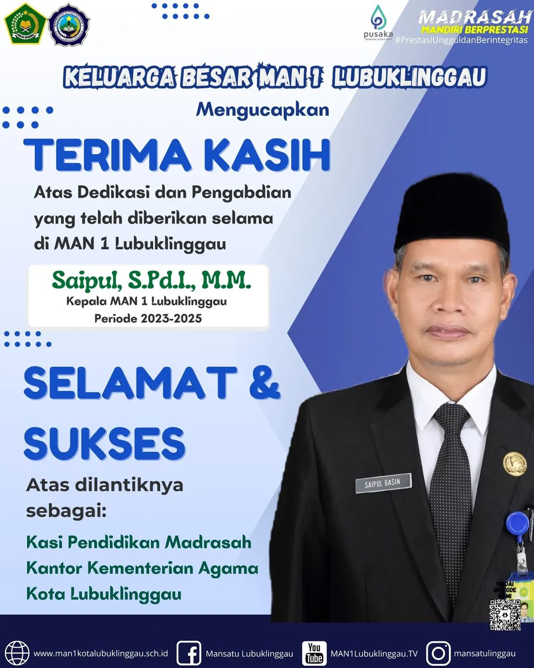 MEDIALUBUKLINGGAU.COM – Keluarga Besar Madrasah Aliyah Negeri (MAN 1) Model Lubuk Linggau mengucapkan terima kasih atas dedikasi dan pengabdian yang telah diberikan selama di MAN 1 Lubuk Linggau, Saipul Basin, S.Pd.I, MM Kepala MAN 1 Lubuk Linggau Periode 2023-2025.