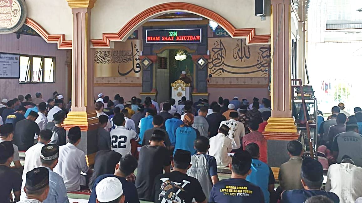 MEDIALUBUKLINGGAU.COM – Petugas Lembaga Pemasyarakatan (Lapas) Kelas IIA Curup bersama Warga Binaan Pemasyarakatan (WBP) rutin melaksanakan ibadah Salat Jumat berjamaah di Masjid At-Taubah, yang berada di dalam lingkungan Lapas, Jumat 26 September 2025.